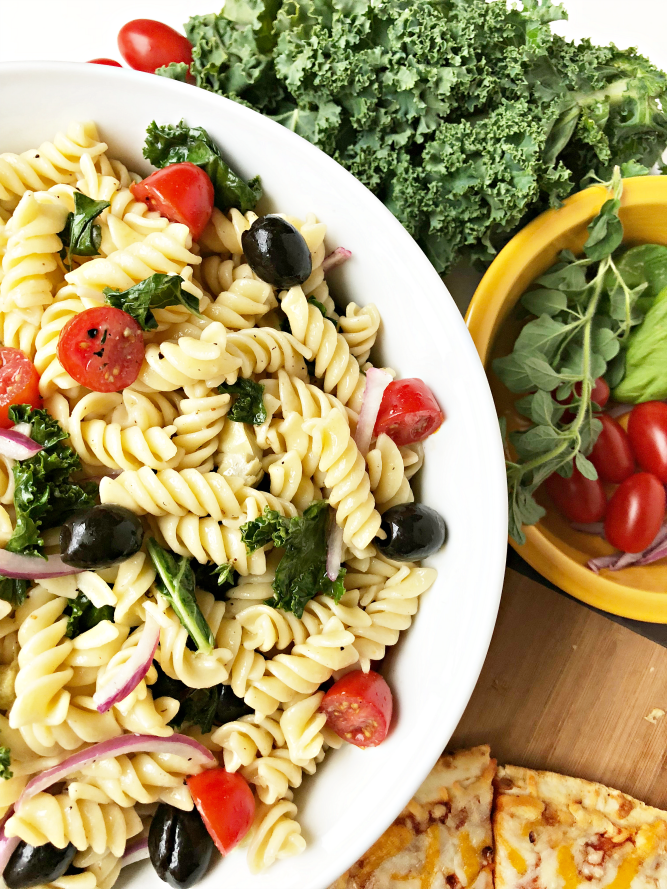 Homemade Antipasto Pasta Salad with a Fresh Herb Vinaigrette (And our favorite pizza to pair with it!)